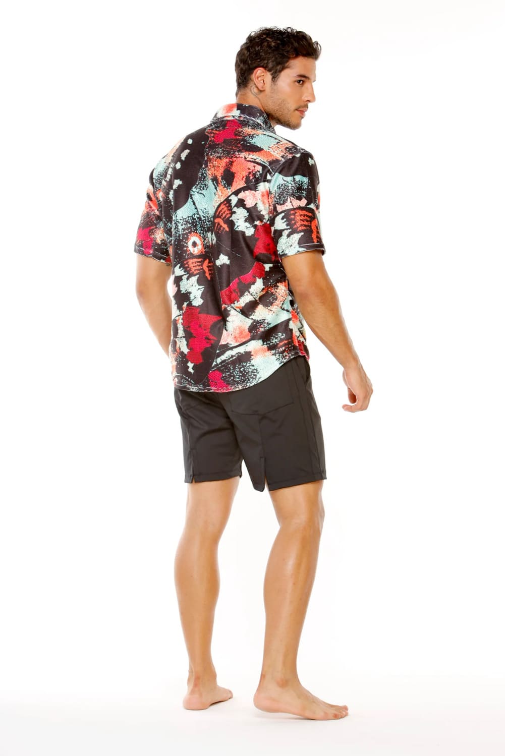 Crafted for the man who values texture and design, this shirt stands out with its high-quality ribbed fabric, adding depth and sophistication to your outfit. The modern abstract print, featuring dynamic splashes of coral and teal on a black canvas, makes it a versatile piece for both day and night in Curazao.