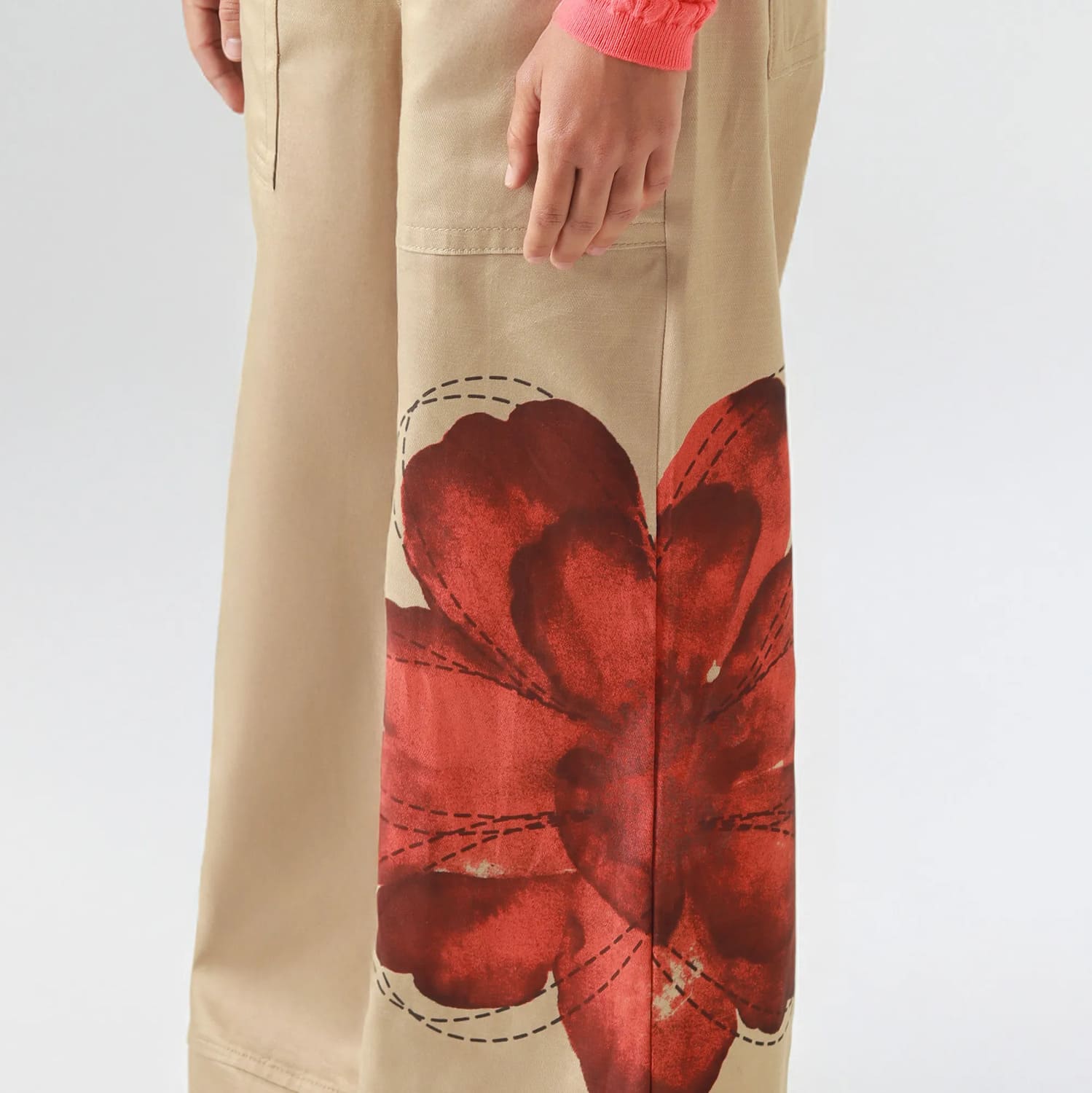 Combine artistic flair with everyday comfort in the Beige Trousers with Large Red Flower Print.