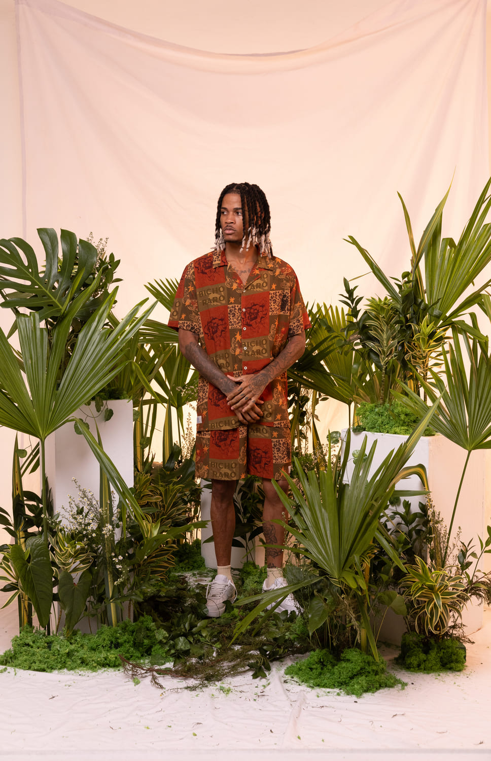 This isn’t just a shirt; it’s a conversation piece. The design showcases a bold patchwork aesthetic in warm rust and earth tones, mixing illustrations of butterflies, stars, and leopard spots with the signature “BICHO RARO” text. It represents transformation and individuality for the modern man.