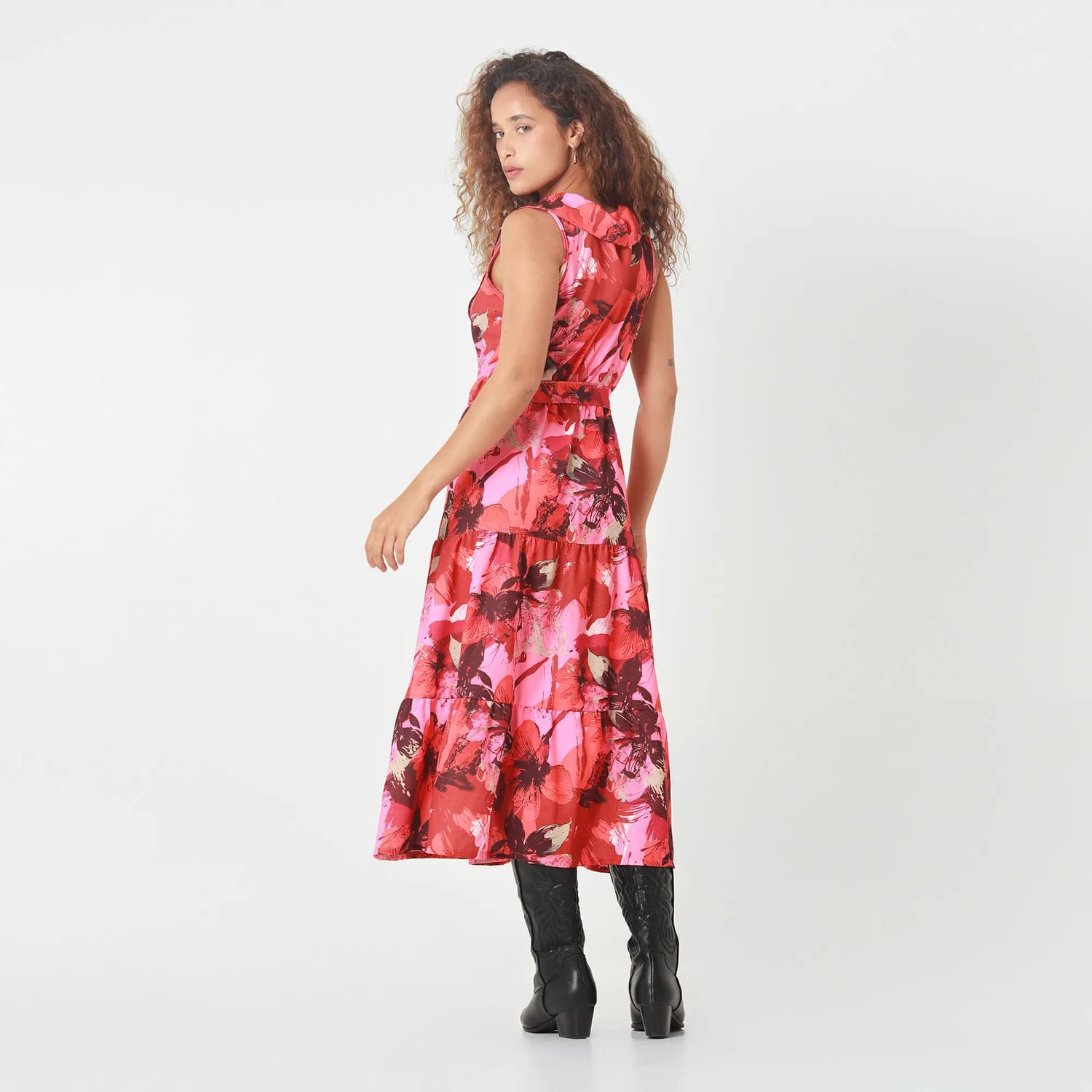 The flowing skirt features a ruffled tier that sways with every step, making it an ideal choice for garden parties, beach weddings, or a sophisticated lunch in Curazao.
