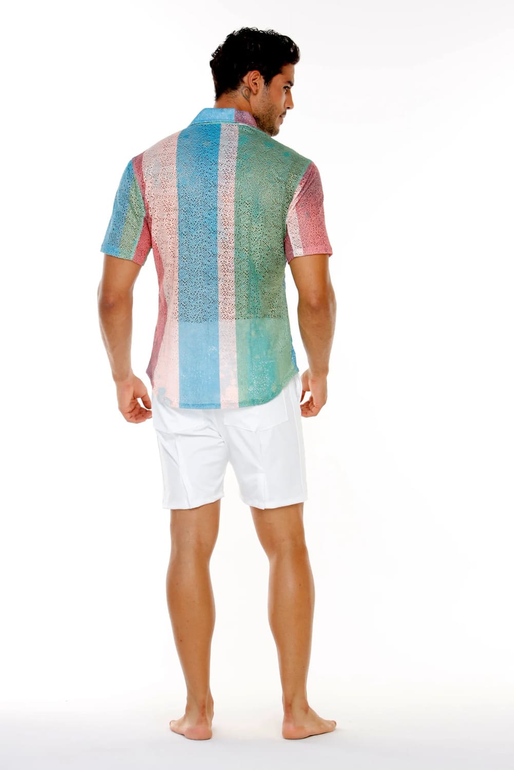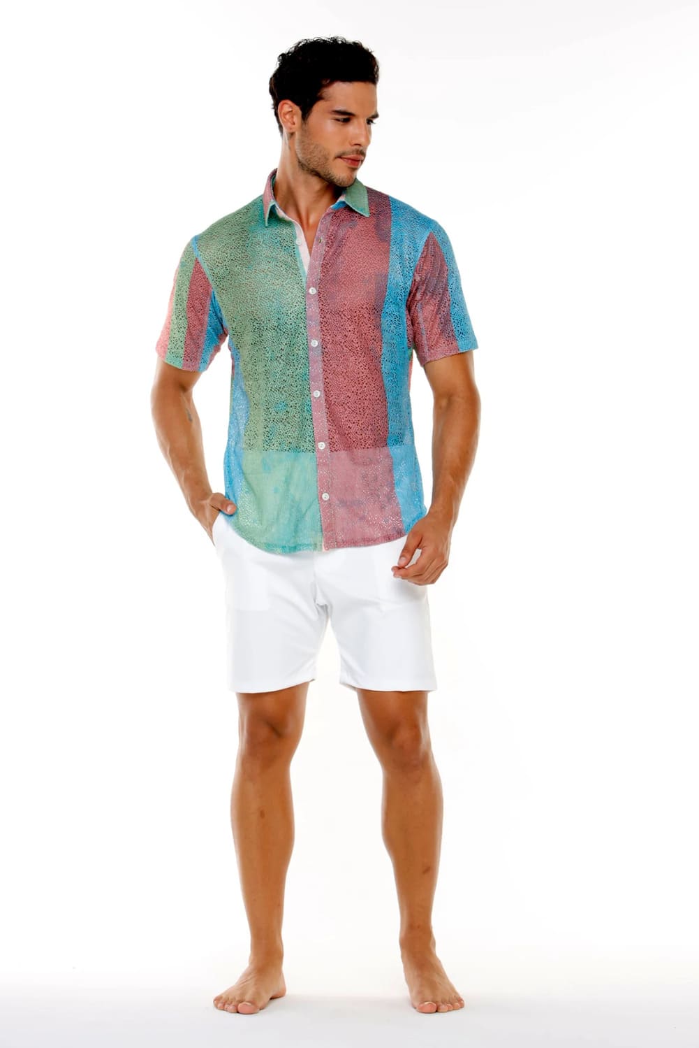 Designed specifically for the tropical heat, this shirt is crafted from a unique mesh fabric that offers maximum airflow without sacrificing style. The vertical color block design blends soft teal, blue, and terracotta hues, creating a sophisticated resort look that visually lengthens the torso.